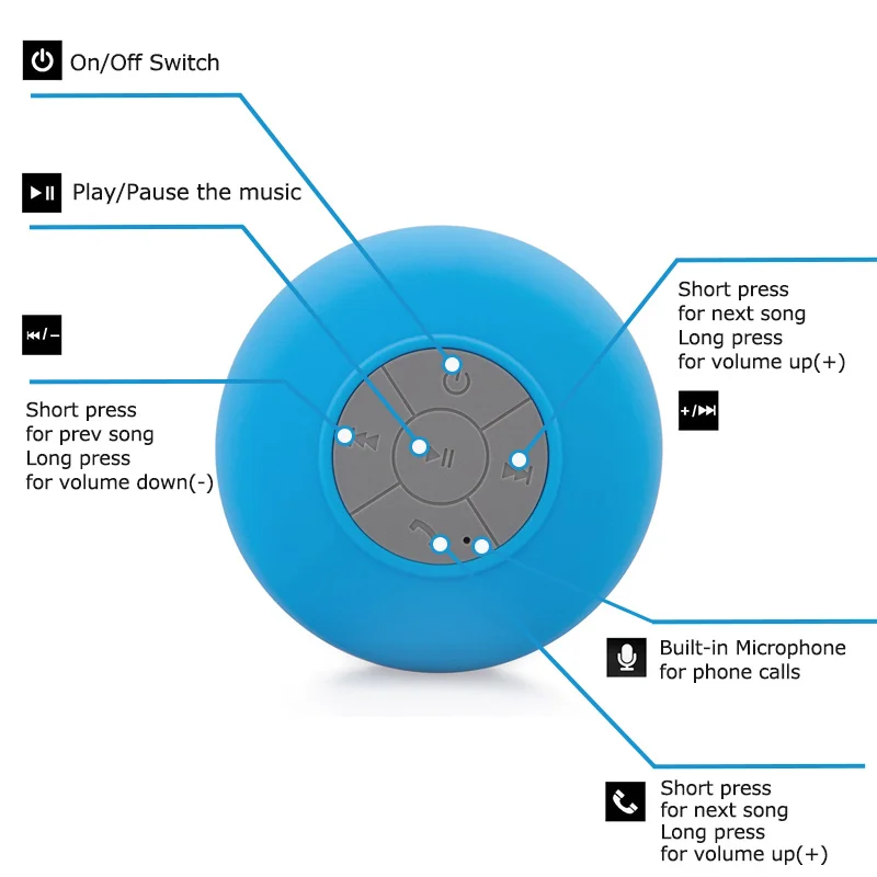 Speaker model no BTS06 Features 1 IPX4 waterproof level 2 Round classic shaped 3 With suction cup 4 Rubber finishing Descriptions * High sensitivity portable Bluetooth shower speaker * Cell phone pick up/hang up and last call redial Parameters * RF range 10m * Frequency response 100HzkHz * S/N ration 75dB * Output 3W. Pairing BTS06 to mobile phone or other device Activate the bluetooth speaker`s pairing mode by when in power off mode, press and hold the on / off button for about 6 seconds until the red LED and blue LED are flashing alternatively Now the speaker is ready for pairing Turn on your mobile phone and activate the bluetooth function. US $629 Water proof wireless BTS06 receiver Handsfree Music Player Bluetooth speaker For iPhone xiaomi Oppo 21 Shop for cheap Outdoor Speakers online?.